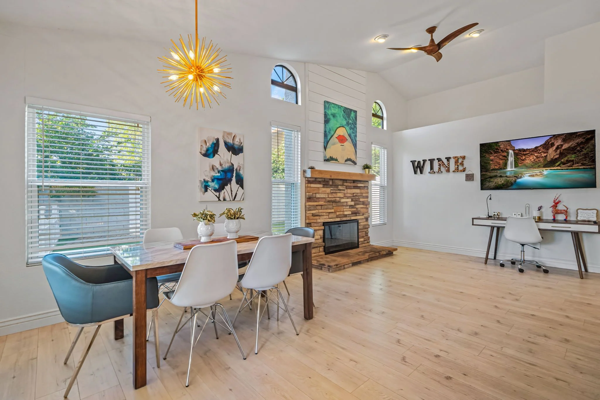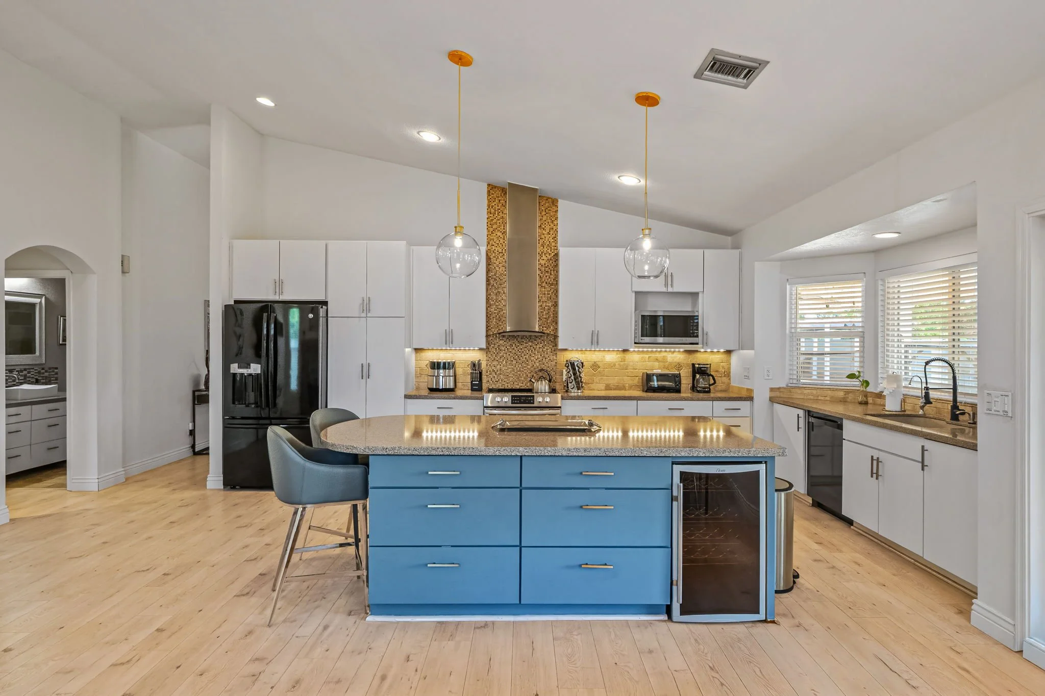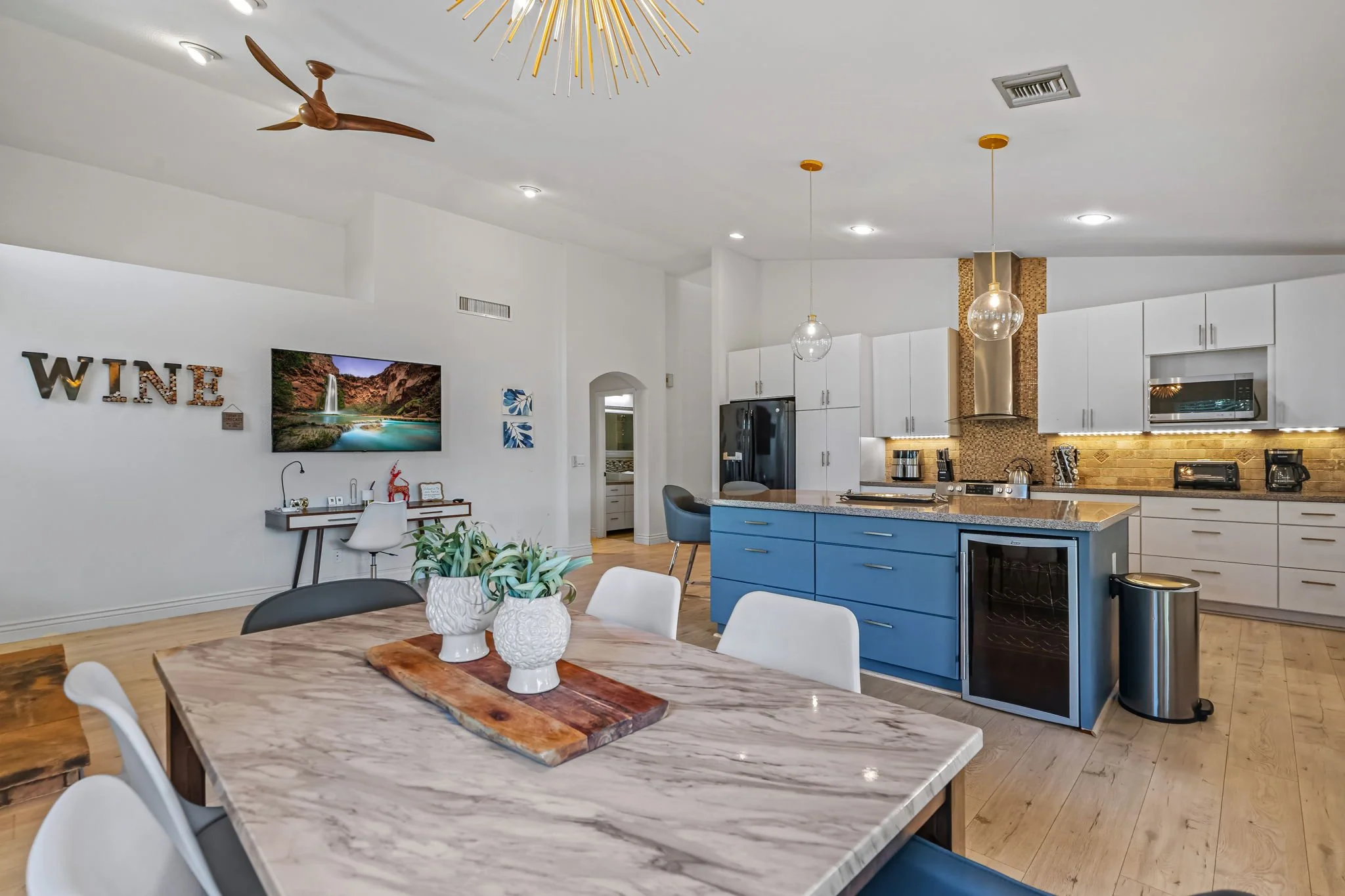 Come home to this cozy modern 3 bedroom home in North Scottsdale. It is an entertainer’s dream with private pool, hot tub and outdoor seating with TV. Each bedroom is furnished with a plush King bed. A fully upgraded kitchen comes with all the necessities to make at home meals for nights in. Enjoy relaxing in the living room with a 85" Smart TV and Wi-Fi. You will be conveniently located to the Pavilions, Kierland and Desert Ridge with abundant restaurant and entertainment options.