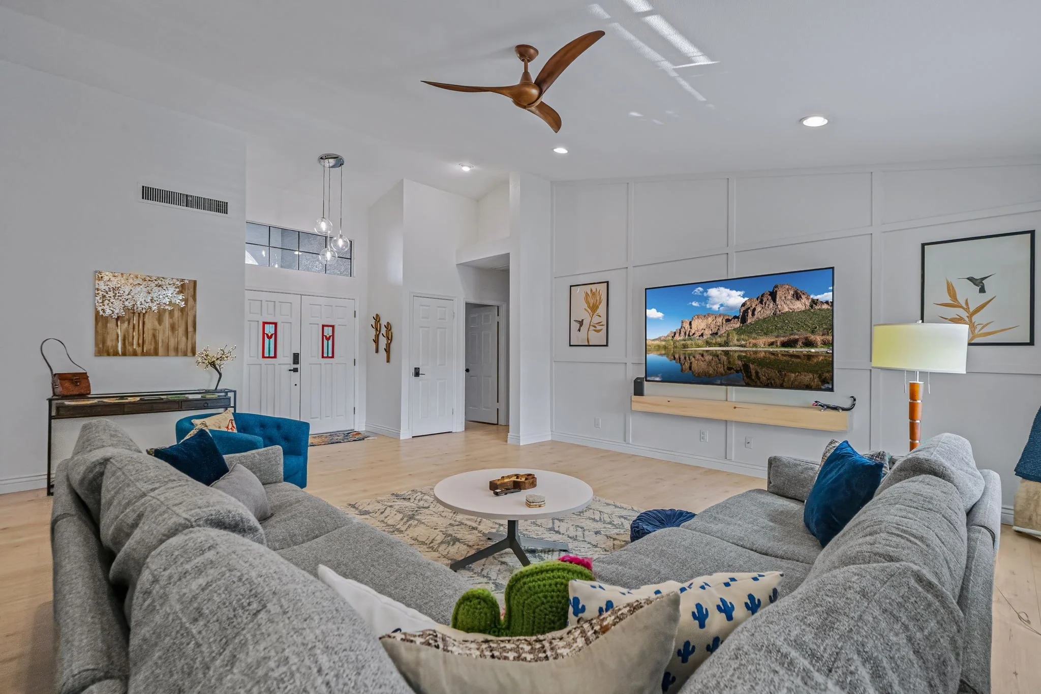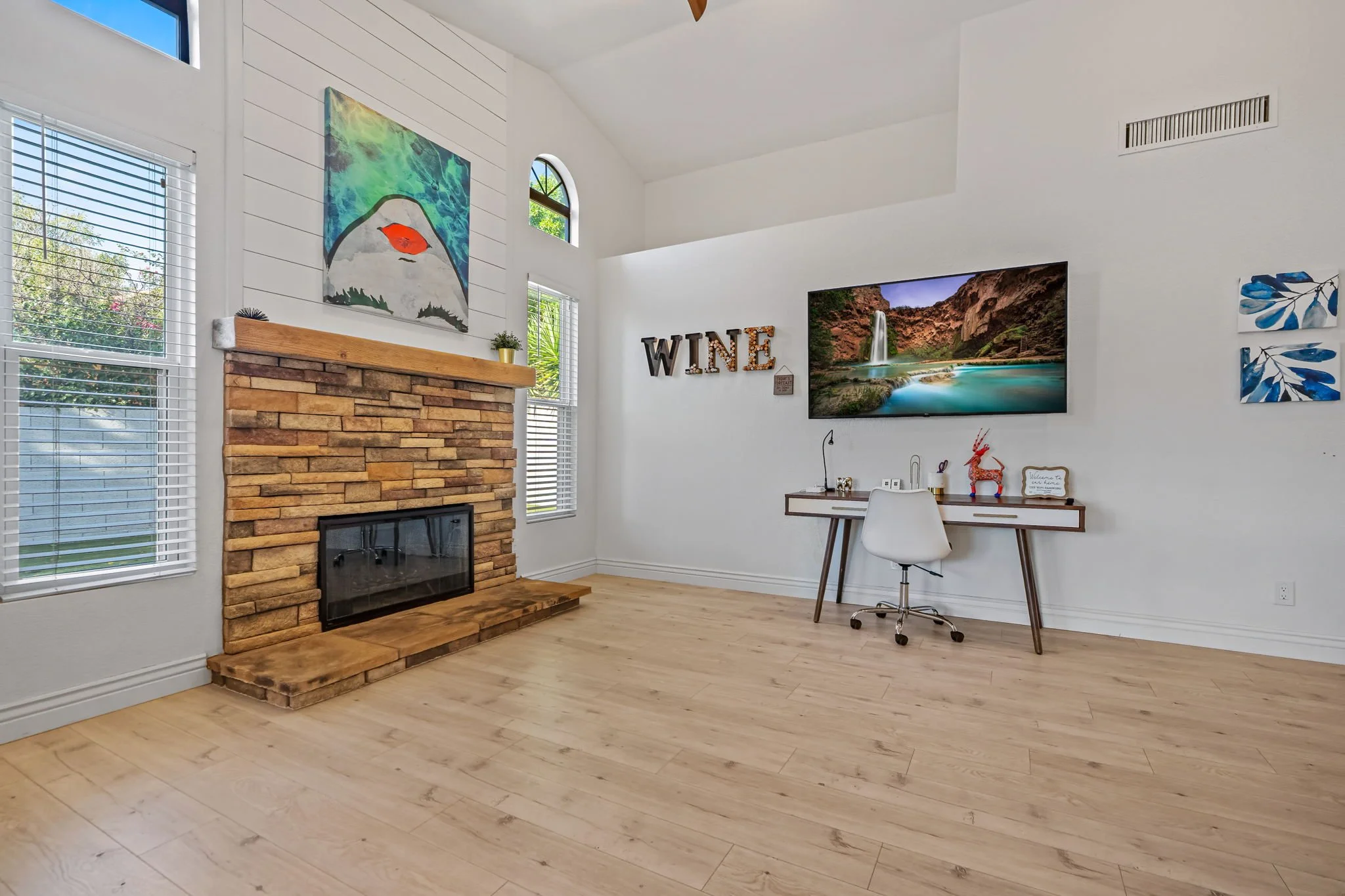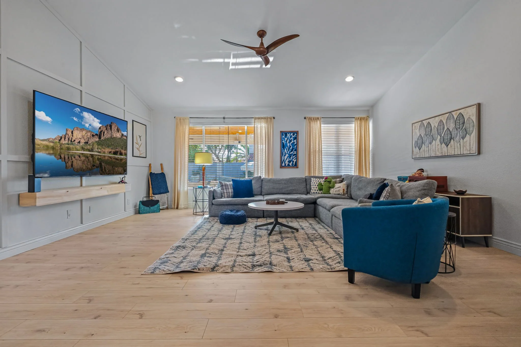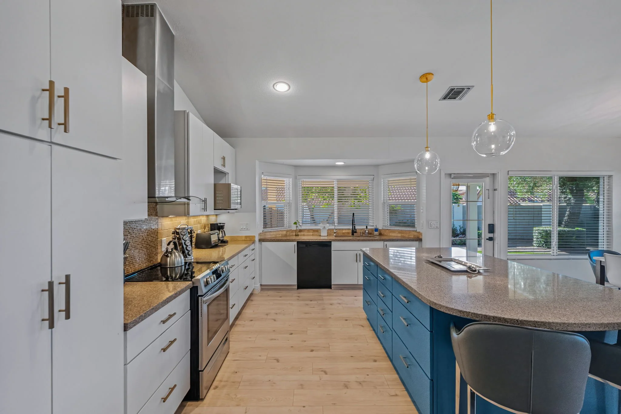 Come home to this cozy modern 3 bedroom home in North Scottsdale. It is an entertainer’s dream with private pool, hot tub and outdoor seating with TV. Each bedroom is furnished with a plush King bed. A fully upgraded kitchen comes with all the necessities to make at home meals for nights in. Enjoy relaxing in the living room with a 85" Smart TV and Wi-Fi. You will be conveniently located to the Pavilions, Kierland and Desert Ridge with abundant restaurant and entertainment options.